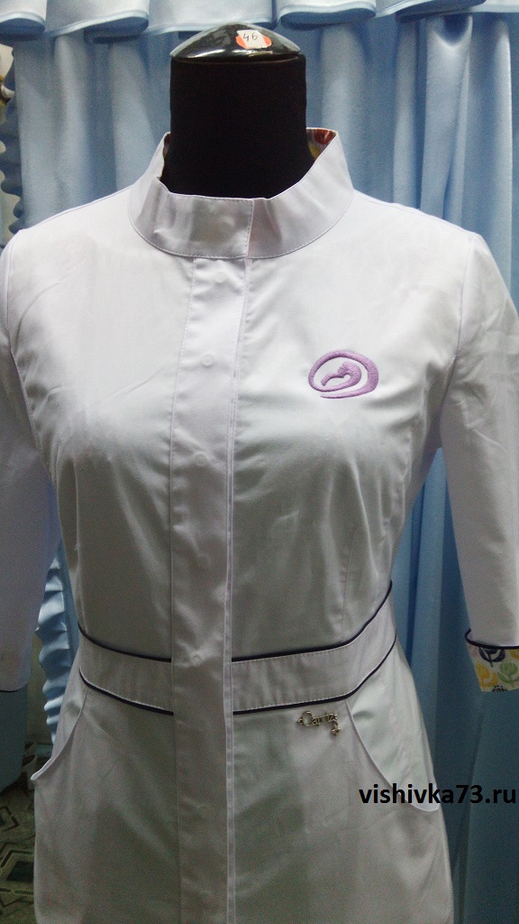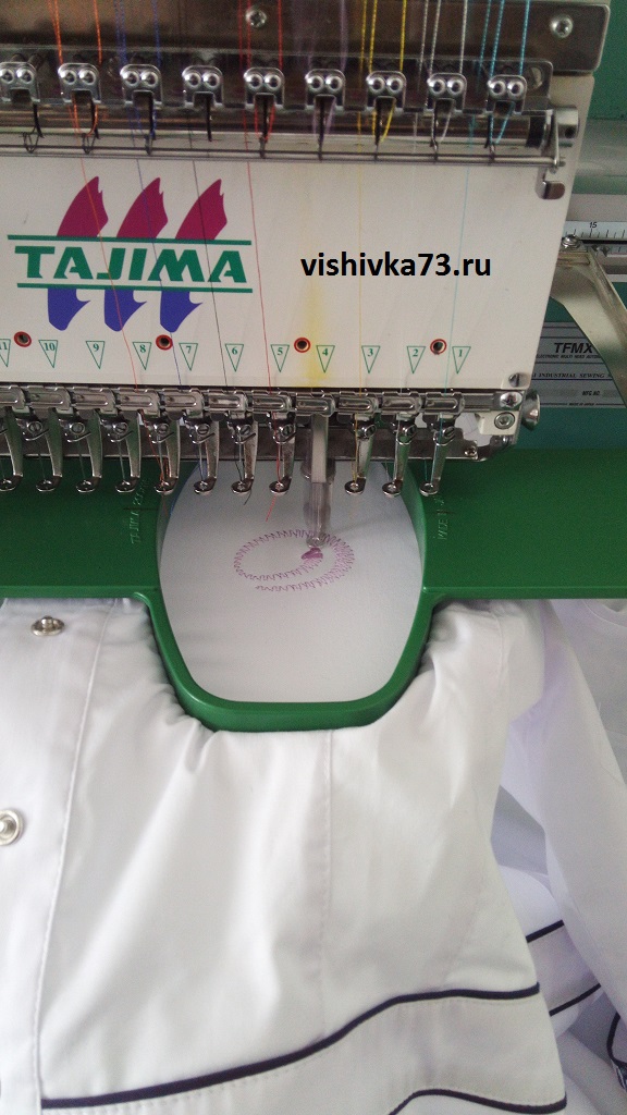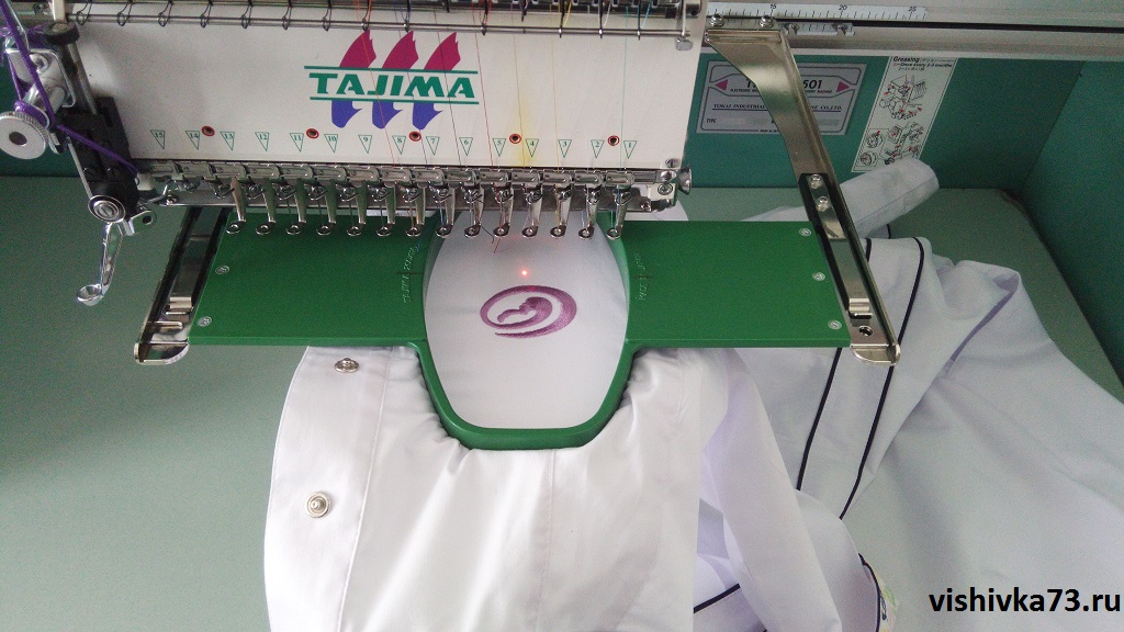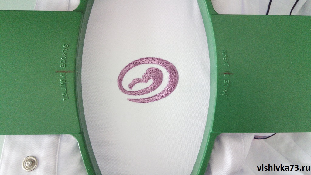 На примере вы видите, как халат крепиться в специальных пяльцах, после чего вышивальная игла начинает свою работу.