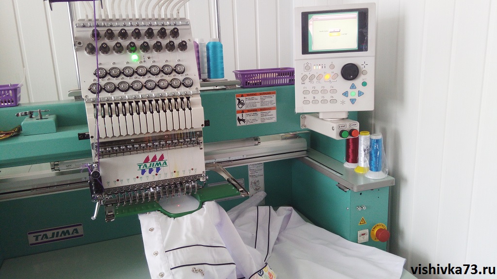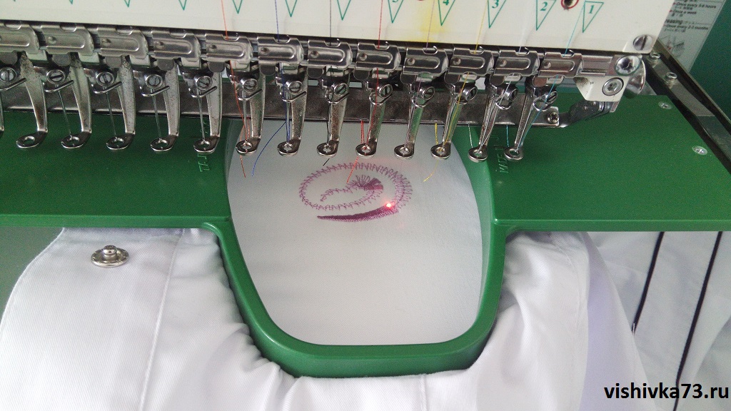 Но вот, наконец, пробник соответствует требованиям, и мы приступаем к вышивке. Сначала изделие или материал размечаются — обмылком указывается место, на которое будет нанесена вышивка. Далее изделие либо запяливается, либо закрепляется на вышивальной машине. После этого по загруженной в машине программе происходит нанесение.
